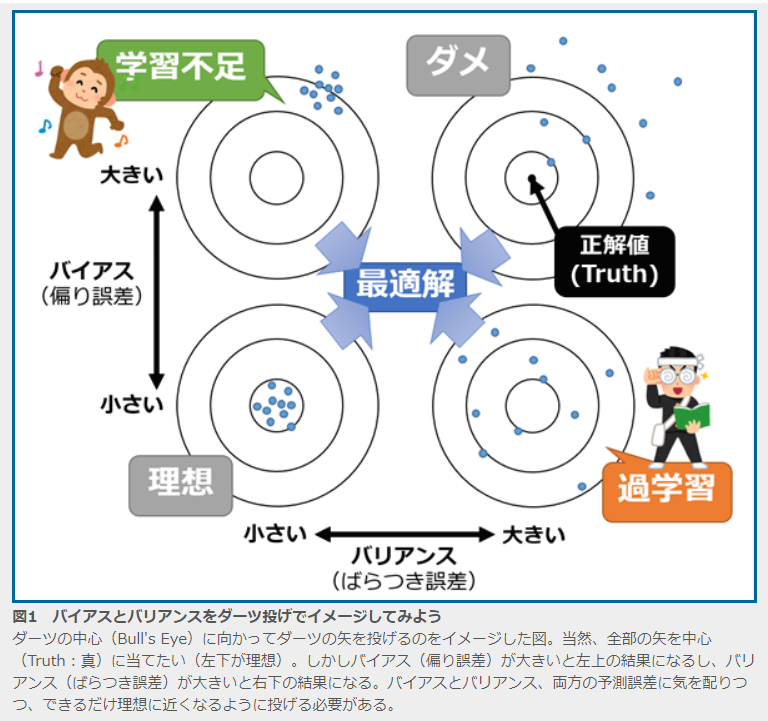 モデルの予測においてバリアンス(ばらつき誤差)が大きすぎる場合、そのモデルは訓練データのノイズまで学習してしまっている(=テストデータなど未知のデータでは正確に予測できない)。いわゆる「過学習(=過剰適合:over-fitting)」の状態である(図1)。