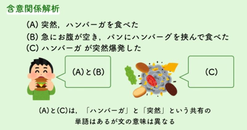 含意関係解析では,違う表現で書かれていても,同じ意味(出来事や概念)はまとめ,そうでないものは,区別できるというところが重要です。