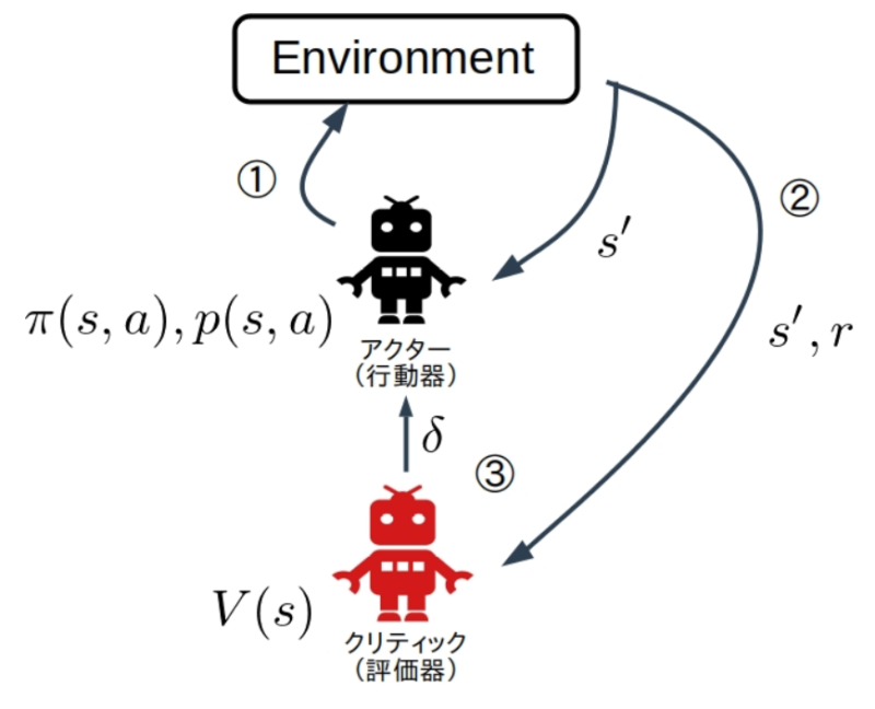 ③:得られた状態s′、報酬rを使ってアクターの取った行動の評価し、アクターに通知。アクターは評価をもとに方策の更新します。