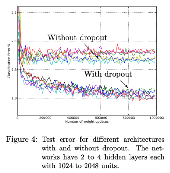 下記のグラフはDropoutの論文に掲載されている実験結果です。without dropoutに比べて、with dropoutではEPOCHを重ねても過学習を抑制でき、エラーレートを落としていくことができています。