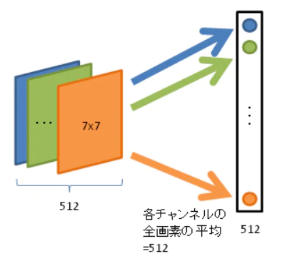233 グローバルアベレージプーリング(GAP) 2021.10.112021.10.21 全結合層の代わりに特徴マップの平均値を1つのユニット(ニューロン)の値にする。 各チャンネル(面)の画素平均を求め、それをまとめます。そうすると、重みパラメータは512で済みます。