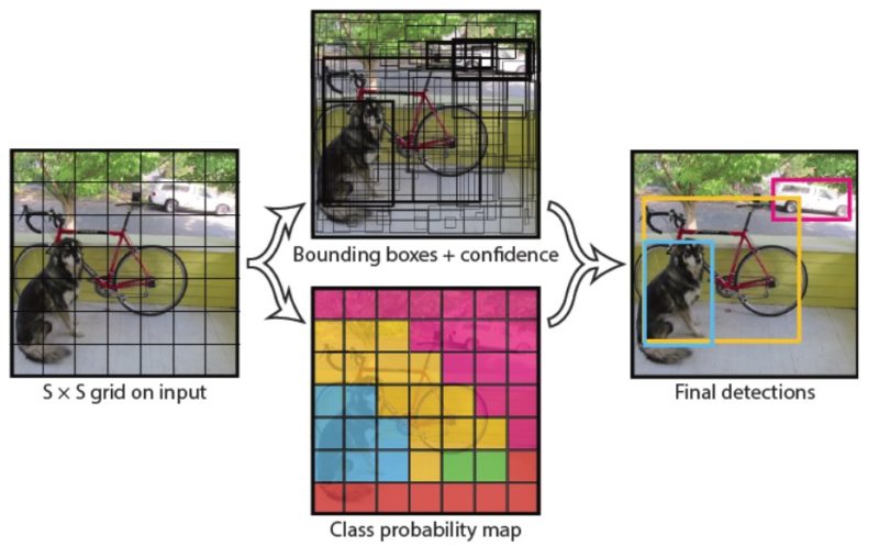 272 YOLO 2021.10.122021.10.24 You Only Look Once:位置の特定とクラスの式物を同時に行う1段階モデル。ディープラーニングにおける物体検出の手法の一つ。画像内で物体と思われる領域の検出と物体の識別を同時に行う。 YOLOはそれまでの境界設定と物体検出という二段階で行われていた作業を一度に行うという点に革新性があります。(そのことでEnd-to-End型かつ高速化に成功しました。)それゆえにYou Look Only Onceというタイトルになっています。