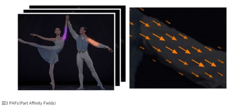 2つ目は、各身体部位間のつながり得る可能性を表すベクトルマップを予測するネットワークです。前回も少し説明したPAFs(Part Affinity Fields)です。つながりうる身体部位間を結ぶ領域中の全ピクセルに対して、方向ベクトルが定義されます。このベクトルは画像の横軸xと縦軸yの2チャンネルのheatmapとして表されます。図3は、左肩と左肘の方向ベクトルマップを可視化したものです。複数人が写っている場合、複数の左肩と左肘が存在することになりますが、これらの繋がりを一括して推定することができます。