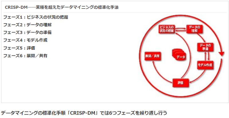 Cross-Industry Standard Process for Data Mining:データマイニングのための産業横断型標準プロセス。主にデータを分析することに主眼を置いている。