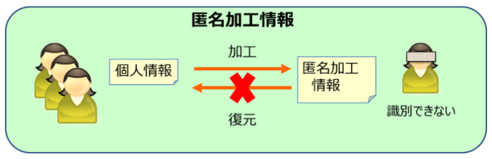 347 匿名加工情報 2021.10.122021.10.26 特定の個人を識別することができないように個人情報を加工して、特定性を低減したデータ。 匿名加工情報とは、特定の個人を識別することができないように個人情報を加工し、当該個人情報を復元できないようにした情報のことをいいます。 >また、匿名加工情報は、一定のルールの下で、本人同意を得ることなく、事業者間におけるデータ取引やデータ連携を含むパーソナルデータの利活用を促進することを目的に個人情報保護法の改正により新たに導入されました。