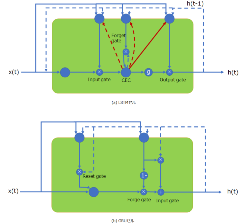 GRU(Gated Recurrent Unit)セルは、LSTMと同様の性能を持つとされており、LSTMより計算量が少なく、高速に学習を進めることができます。