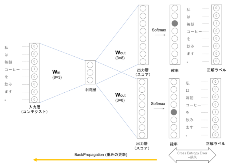 skip-gramの入力層はひとつで出力層はコンテクストの数だけ存在します。それぞれの出力層で個別に損失を求め、それらを足し合わせたものを最終的な損失とします。