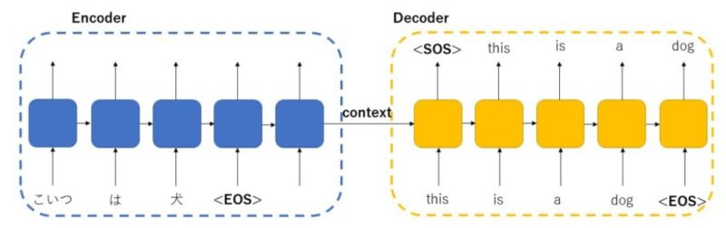 Seq2seqは,エンコーダとデコーダから構成されています。エンコーダは入力系列の各要素を処理し,捉えた情報を「文脈」と呼ばれるベクトルにコンパイルします。入力系列全体を処理した後に,エンコーダは「文脈」をデコーダに送り,デコーダは出力系列の各要素を次々と生成していきます。