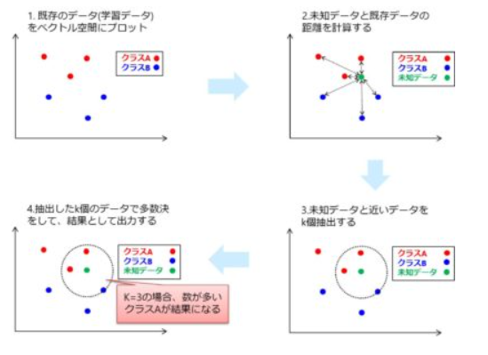 k近傍法:k-Nearest Neighbor:主に教師あリ学習の分類に用いられるアルゴリズム。学習データをベクトル空問上にプロットしておき、未知のデータの近くにあるk個の学習デー 夕が属するクラスの多数決結果から未知のデータ のクラスを推定する。