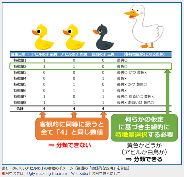 概念的にはノーフリーランチ定理に似ており、機械学習で必修の定理として一緒に学ぶことが多い。ノーフリーランチ定理は「あらゆる問題を効率よく解けるような“万能”の機械学習モデルや探索/最適化のアルゴリズムなどは存在しない」ことを主張する用語である。一方、みにくいアヒルの子の定理は「仮定/事前知識がない場合には、分類性能が高くなるような“最良”の特徴表現/特徴量セットも存在しない」ことを主張する。分類における「類似性」という単純な概念でさえ、基本的には問題領域における暗黙の仮定(何らかの事前知識や偏向)に依存しているということである。