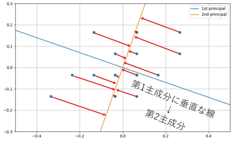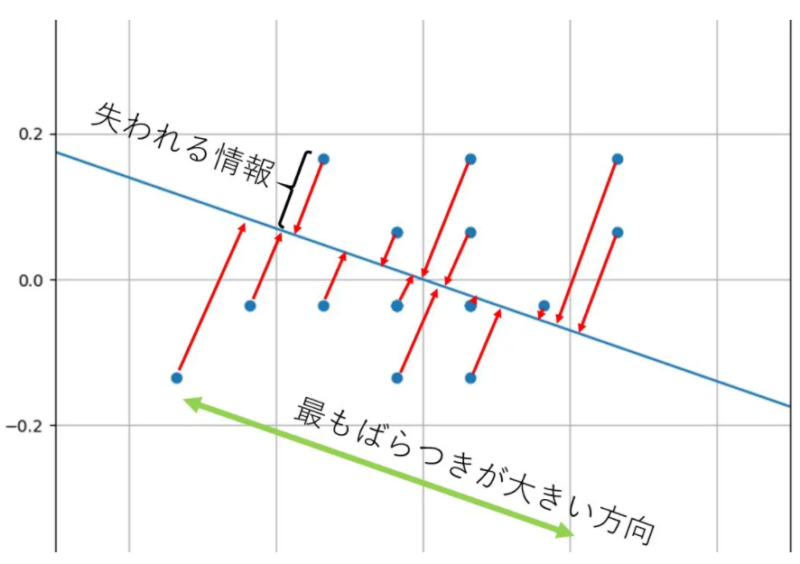 448 PCA(主成分分析)方策 2021.10.132021.10.29 主に教師なし学習の次元削減に用いられるアルゴリズム。データの各変数間の相関がなくなるように変数を変換していく。 第2主成分というのか、それは第1主成分が捨ててしまった情報、つまり赤矢印方向の直線に写し取った情報なのです。