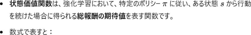 ・本問では「特定の状態から行動を続けた場合」の期待値について尋ねているため、 状態価値関数が適切です。