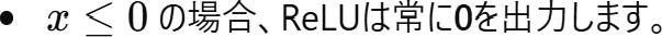 ReLUは、ニューラルネットワークにおける活性化関数の1つで、以下の特徴を持ちます: